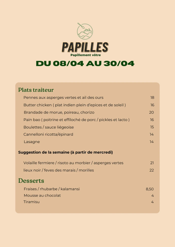 Le menu change régulièrement, tenez-vous informer sur notre site ou sur nos réseaux sociaux. En plus du menu, nous ajoutons toutes les semaines des suggestions, restez à l'affût.